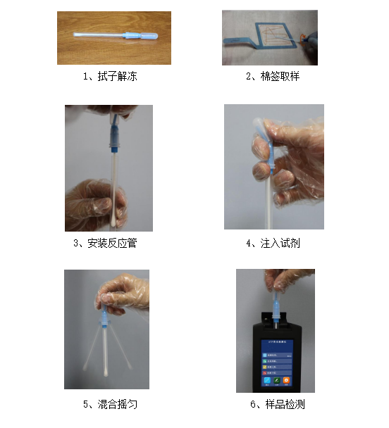 6、樣本檢測(cè):將拭子插入處于待檢測(cè)界面的ATP儀器實(shí)驗(yàn)倉(cāng)內(nèi),閉合儀器上蓋,開始檢測(cè)。