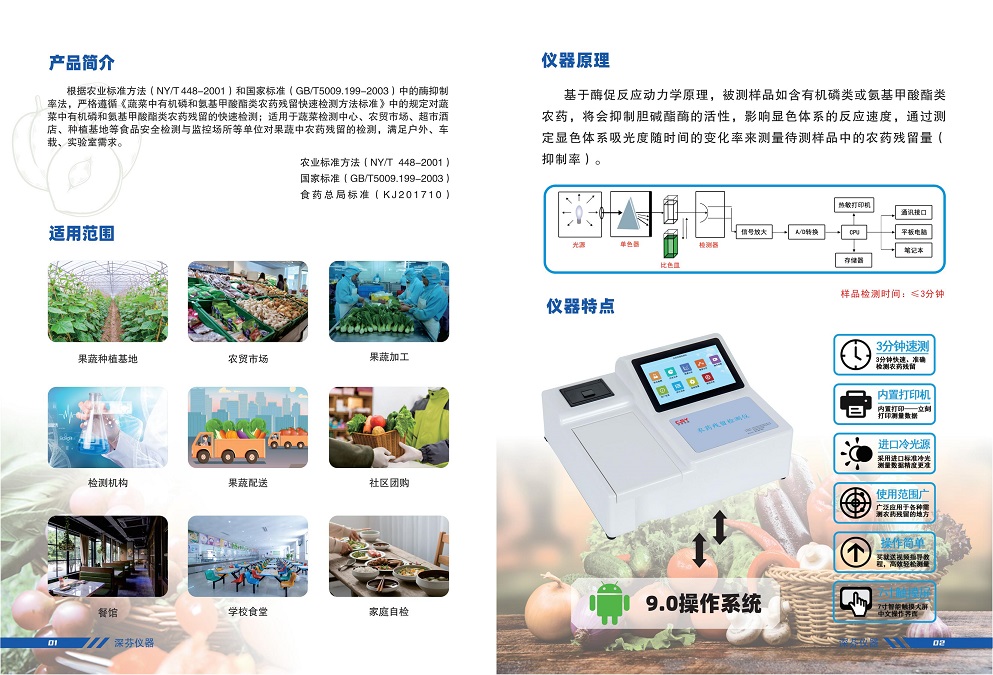 深芬儀器生產(chǎn)的安卓智能型農(nóng)藥殘留測(cè)定儀;是根據(jù)農(nóng)業(yè)標(biāo)準(zhǔn)方法(NY/T 448-2001)和國(guó)家標(biāo)準(zhǔn)(GB/T5009.199-2003)中的酶抑制率法,嚴(yán)格遵循《GB/T5009.199-2003蔬菜中有機(jī)磷和氨基甲酸酯類農(nóng)藥殘留快速檢測(cè)方法標(biāo)準(zhǔn)》中的規(guī)定對(duì)蔬菜中有機(jī)磷和氨基甲酸酯類農(nóng)藥殘留的快速檢測(cè)??蓮V泛應(yīng)用于各級(jí)蔬菜檢測(cè)中心、農(nóng)貿(mào)市場(chǎng)、超市、環(huán)保機(jī)構(gòu)、蔬菜種植基地、飯店、車載及實(shí)驗(yàn)室等食品安全檢測(cè)與監(jiān)控場(chǎng)所等單位對(duì)果蔬中農(nóng)藥殘留的檢測(cè)。農(nóng)藥殘留測(cè)定儀能準(zhǔn)確、快速檢測(cè)出蔬菜、水果、糧食、茶葉以及土壤中有機(jī)磷和氨基甲酸脂類農(nóng)藥殘留的快速檢測(cè)。